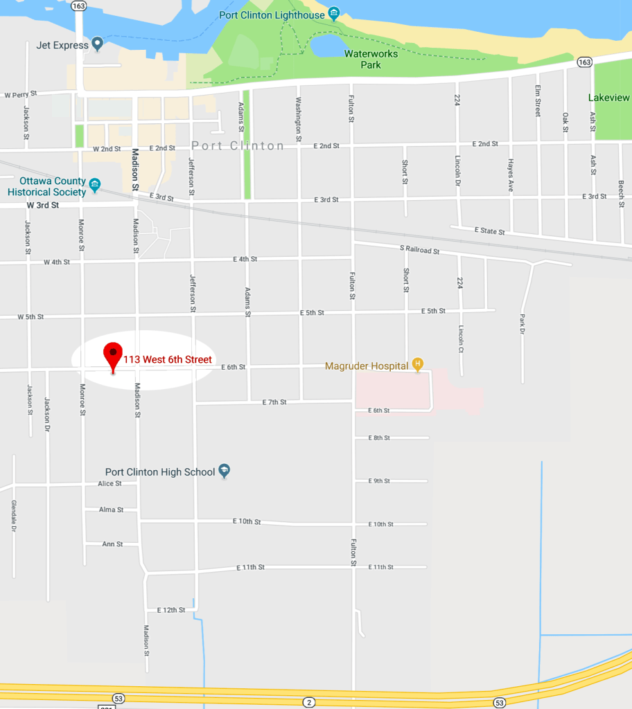 From Cleveland (77 miles): Follow I-90 W/OH-2 W. Continue onto OH-2 W. Take exit 121A-B to merge onto OH-163 W (E Perry St) toward Port Clinton. Turn left onto Fulton St. Turn right onto East Sixth St and proceed 3½ blocks to Rosemary Schramm Gallery.